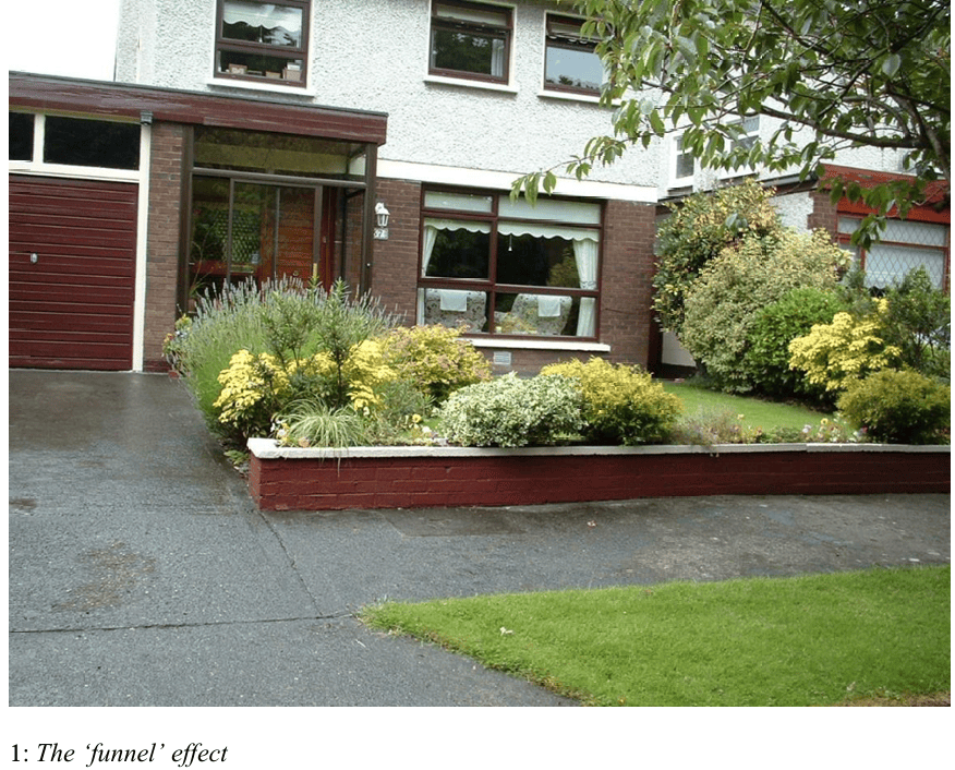 - All gardens had a strong aesthetic dimension to them which included architectural features as well as natural plantings.In attempting to make sense of these empirical and spatial trends, we can detect a number of contradictions which manifest themselves in or through the spatial entity of the garden. The physical boundaries which surround the garden inhibit physical movement into the front garden, yet the aesthetic display encourages visual engagement. Therefore, privacy is not an issue with regard to the public seeing into the garden from the street-side, yet it is an issue with regard to one’s immediate neighbours as a screen tends to block the adjoining neighbours. While the public are allowed to view the garden they are hindered in seeing into the house itself by the presence of net curtains on the front windows and doors. To unravel the nature of these contradictions we thus need to investigate the essential structure of the front garden and those forces which determine that structure. And as front gardens are designed and constructed by human endeavours, in combination with the forces of nature inherent in natural ecosystems, their visual analysis helps to uncover some of the complex interactions between social and natural processes.